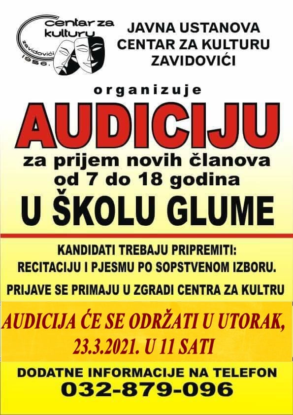 JU Centar za kulturu Zavidovići i ove godine organizuje audiciju za prijem novih članova u “Školu glume”.
