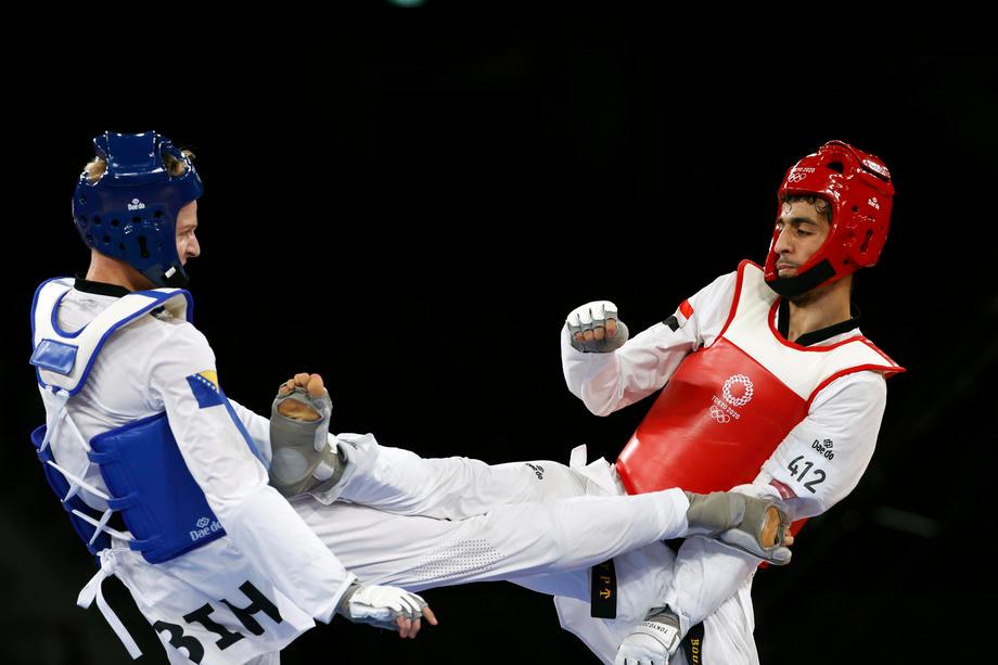 Bosanskohercegovački taekwondoista Nedžad Husić (19) u borbi za bronzanu medalju na Olimpijskim igarama u Tokiju u kategoriji do 68 kilograma