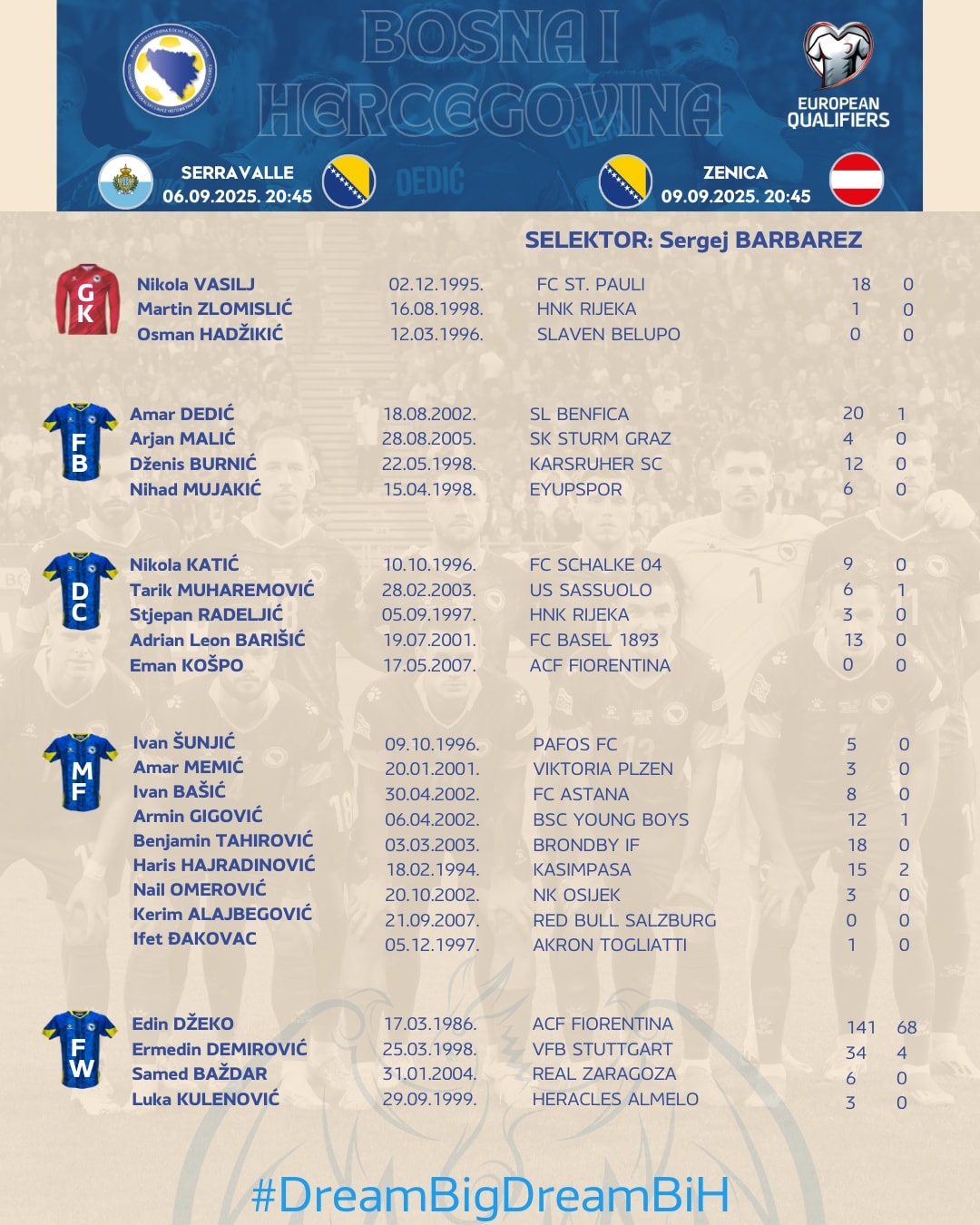 Selektor fudbalske reprezentacije Bosne i Hercegovine Sergej Barbarez objavio je danas spisak pozvanih igrača za nastavak kvalifikacija za Svjetsko prvenstvo 2026. godine.