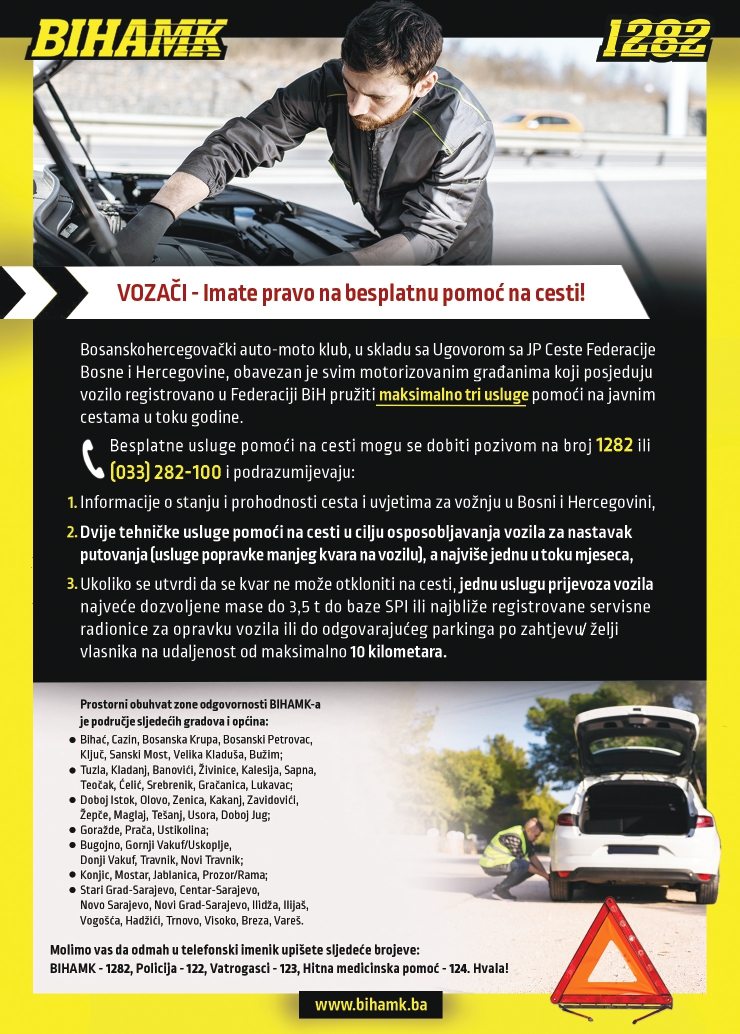 Besplatne usluge pomoći na cesti mogu se dobiti pozivom na broj 1282 ili (033) 282-100, i podrazumijevaju: