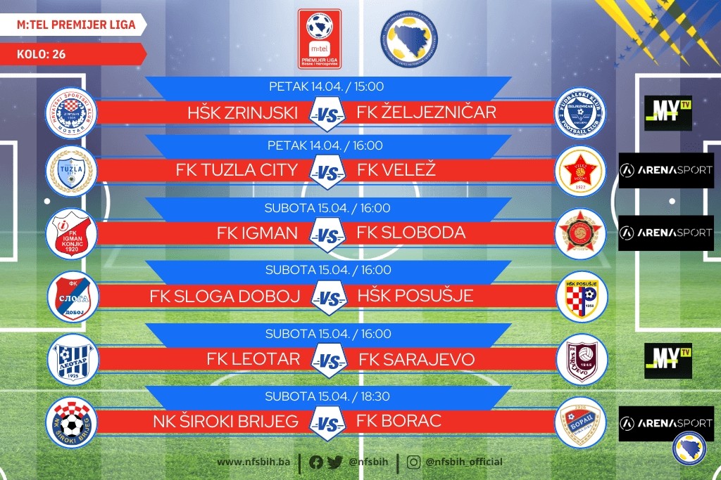 Danas će biti odigrane prve utakmice 26. kola m:tel Premijer lige BiH u fudbalu, dok će kolo biti kompletirano sutra kada su na programu preostali susreti.