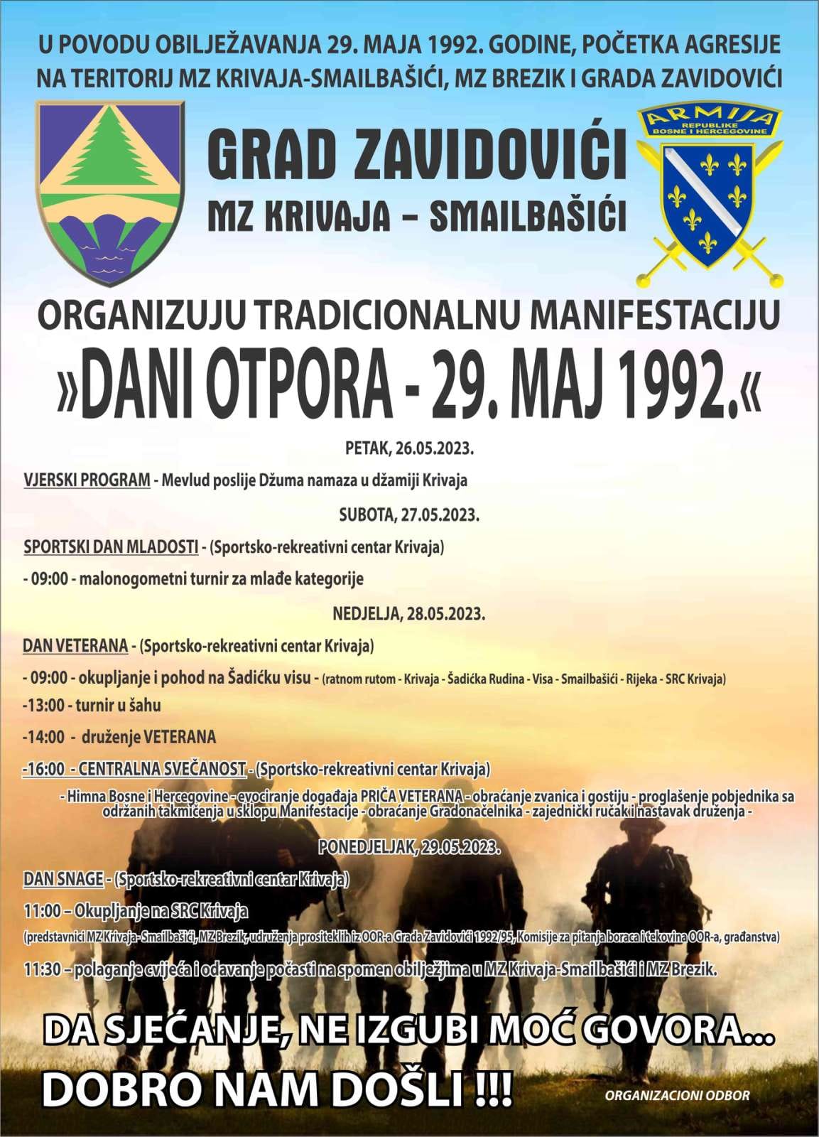 Danas počinje manifestacija “Dani otpora 29.05.1992.” kojom se obilježava početak agresije na teritoriju MZ Krivaja – Smailbašić, MZ Brezik i grad Zavidovići.