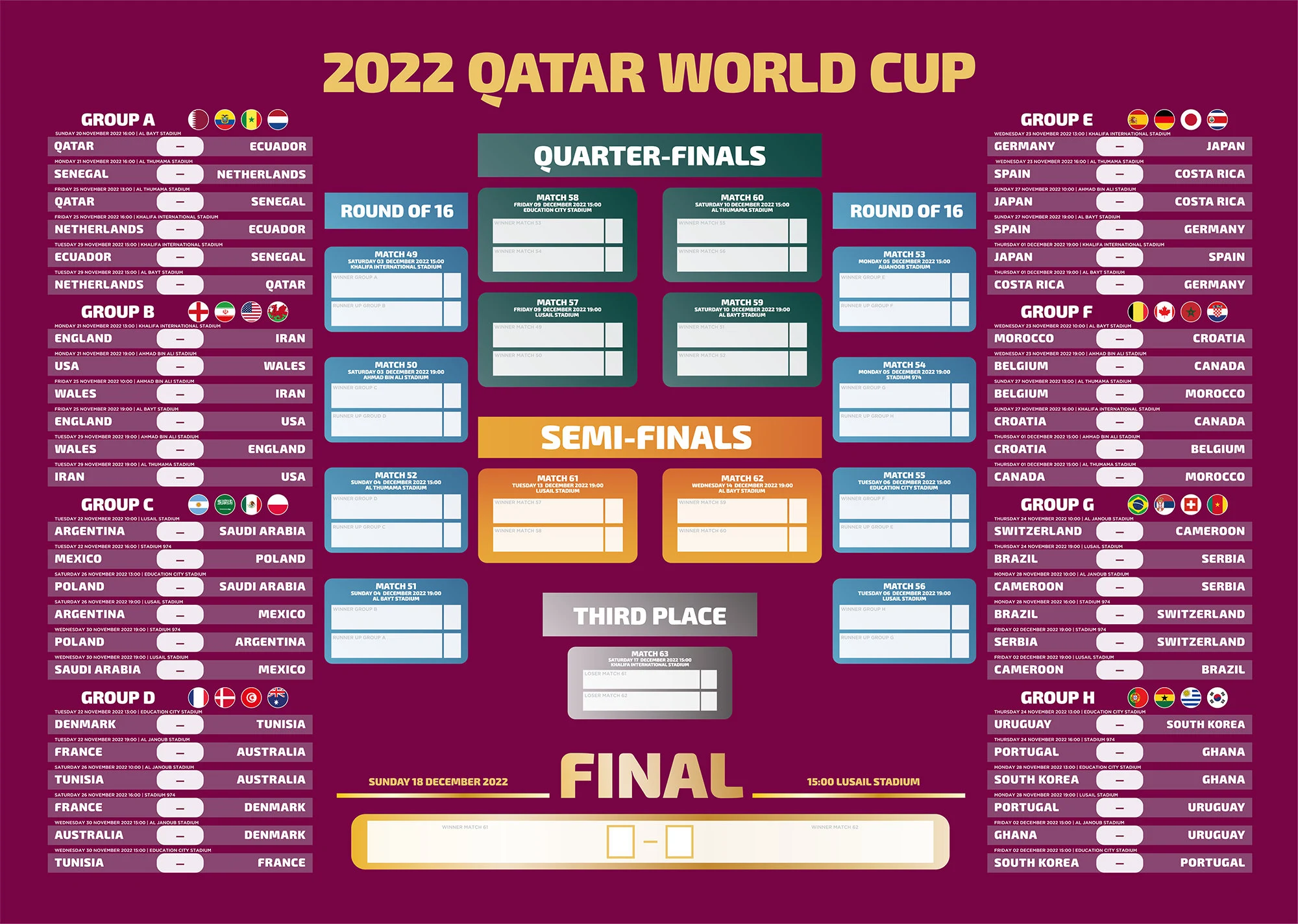 Prva utakmica će biti odigrana danas (subota) s početkom u 17 sati, a u meču grupe A domaća selekcija Katra će igrati protiv Ekvadora. Sutra su na rasporedu tri utakmica, a potom bi se do kraja grupne faze trebale igrati četiri utakmice dnevno.