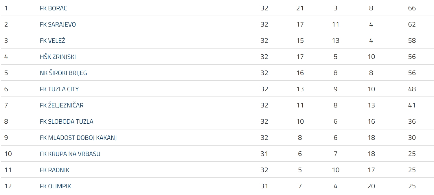 Borac je prvak, Sarajevo je viceprvak, Olimpik će biti izbačen iz takmičenja, a u niži rang bi trebao ići Radnik. Jedina nepoznanica jeste koji će klubovi izboriti izlazak u Evropu, u najboljoj poziciji je Velež, a plasmanu u Evropu se još nadaju i Zrinjski i Široki Brijeg.