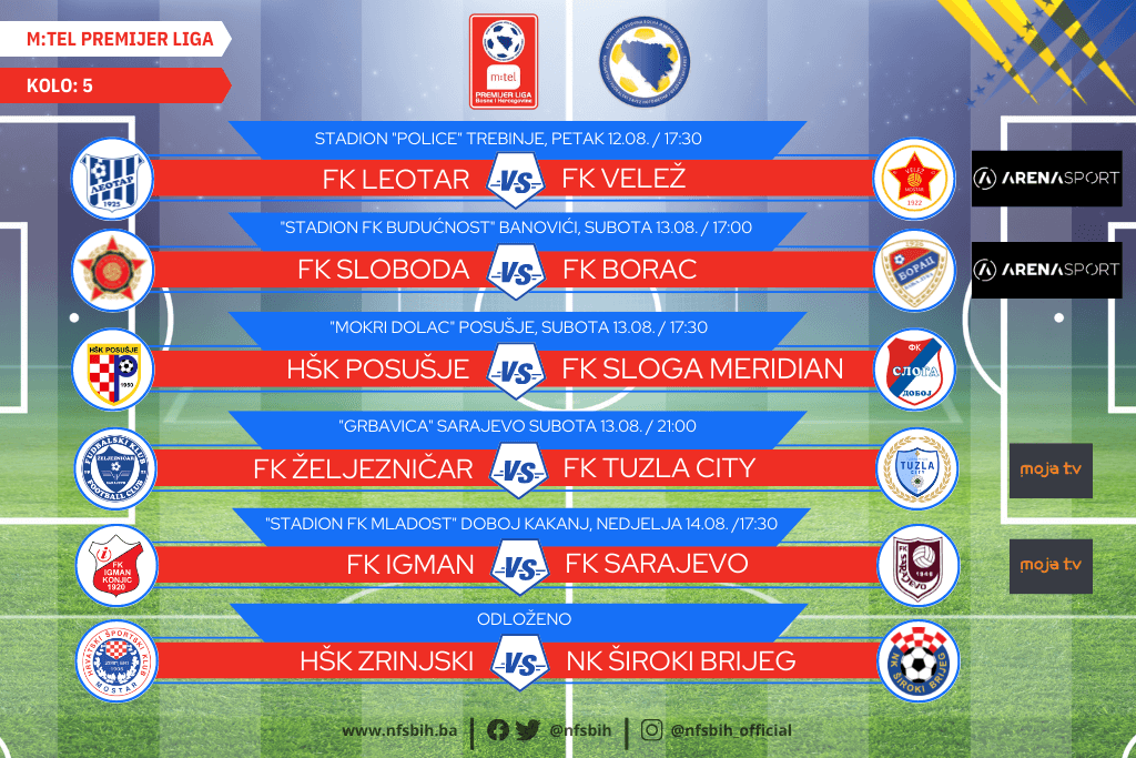 Danas će biti odigran prvi susret 5. kola m:tel Premijer lige BiH u fudbalu, četiri susreta se igraju za vikend, dok je jedan susret odložen.