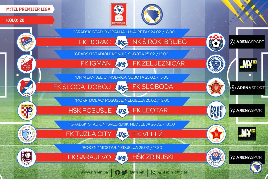 Danas će u Banja Luci biti odigrana prva utakmica 20. kola m:tel Premijer lige BiH u fubalu, dok će ostatak utakmica biti odigrano za vikend, a čime će početi drugi dio ligaške sezone u našoj zemlji.