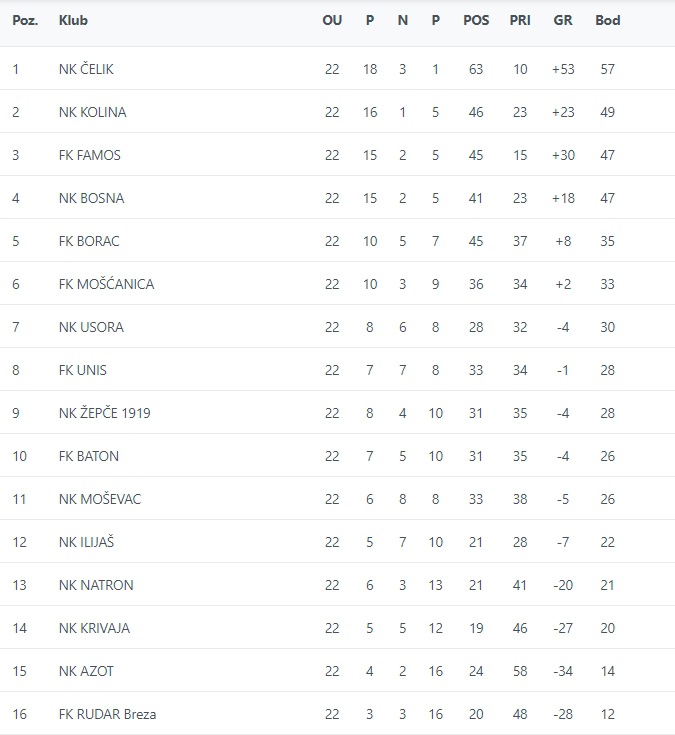 Podsjećamo, jučer je NK Bosna sa 2:1 savladao NK Žepče 1919, dok je u Brezi FK Rudar sa 4:2 bio bolji od FK Mošćanica.