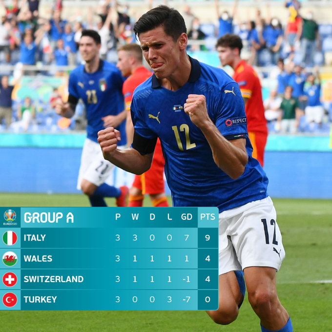 Italija je završila prva s maksimalnih devet bodova i gol razlikom 7:0, Vels je drugi s četiri boda koliko ima i Švicarska, s tim da Velšani imaju gol razliku 3:2, a Švicarci 3:4, tako da će Švicarci morati čekati rasplet u ostalim grupama.