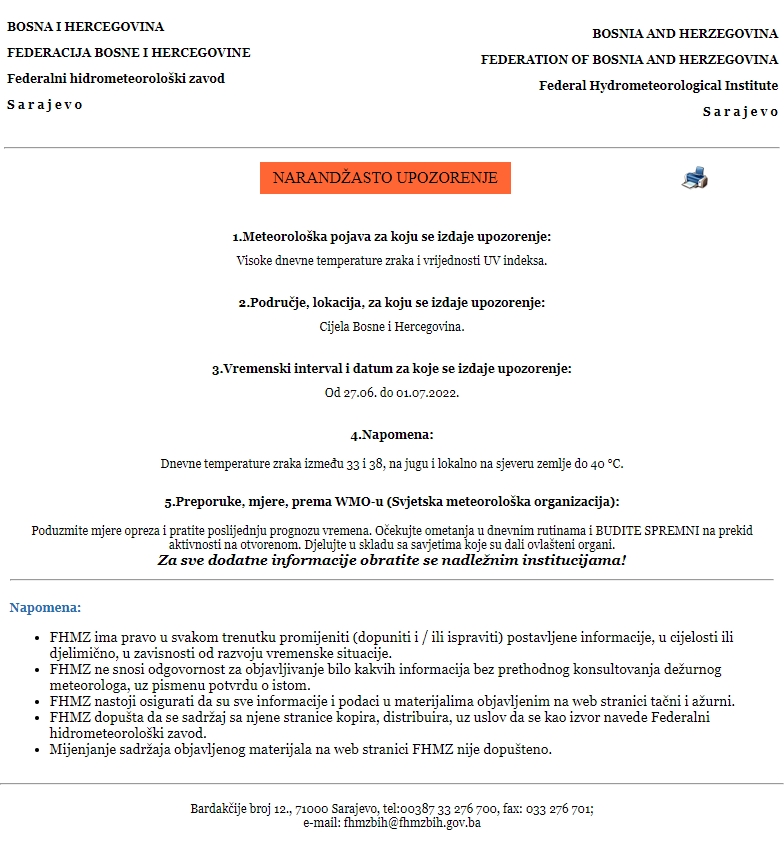 Upozorenje se odnosi na cijelu teritorije Bosne i Hercegovine, a za period od 27. juna (ponedjeljka) do 1. jula (petka).