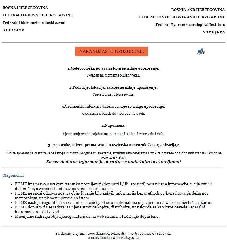 Upozorenje se odnosi na cijeli dan (subota, 4. februar), a za područje cijele Bosne i Hercegovine. Vjetar je umjeren do pojačan na momente i olujan, brzine i do preko 60 km/h.
