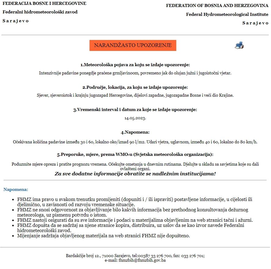 Upozorenje je objavljeno zbog najavljenih intenzivnijih padavina ponegdje praćenih grmljavinom, uz povremeno jak do olujan južni i jugoistočni vjetar.