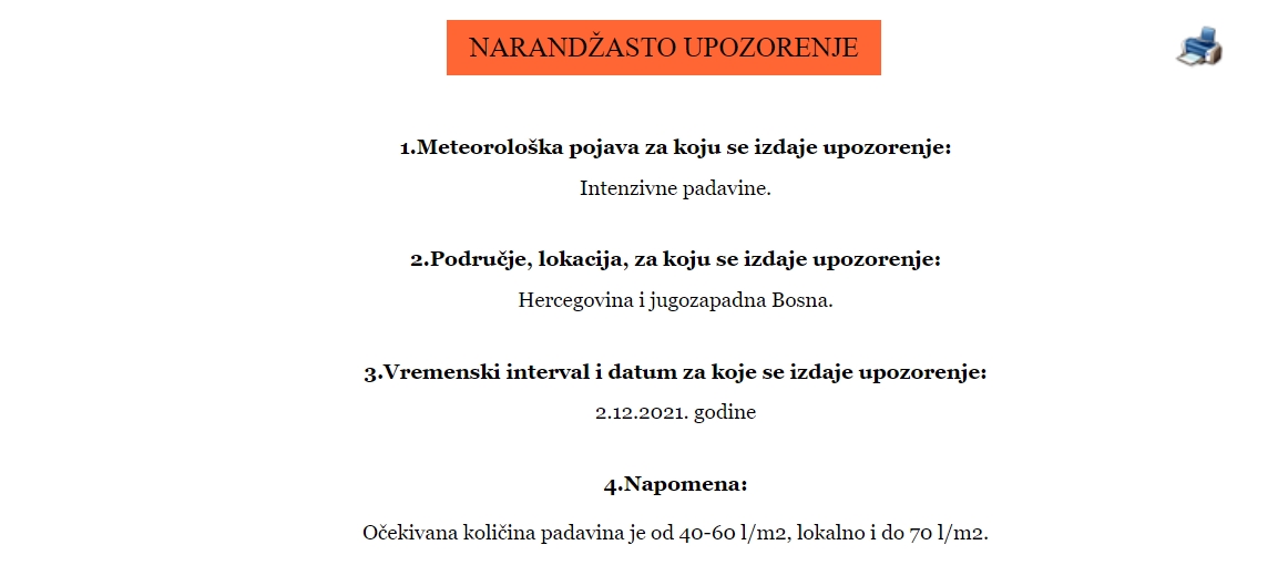 Upozorenje se odnosi na Hercegovinu i jugozapadnu Bosnu, gdje je očekivana količina padavina 40-60 l/m², lokalno i do 70 l/m².
