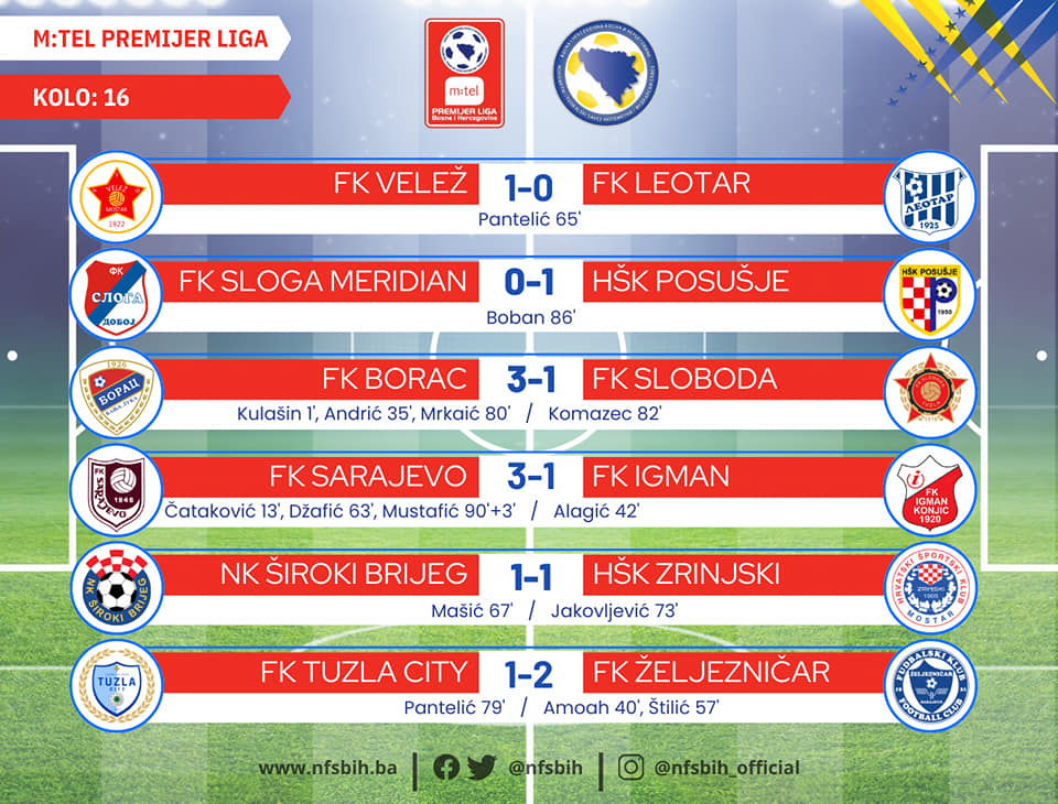 Danas je utakmicom u Srebreniku kompletirano 16. kolo m:tel Premijer lige BiH, a gdje je Željezničar kao gost savladao Tuzla City rezultatom 1:2.