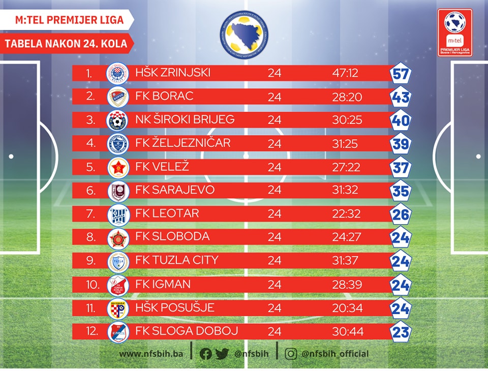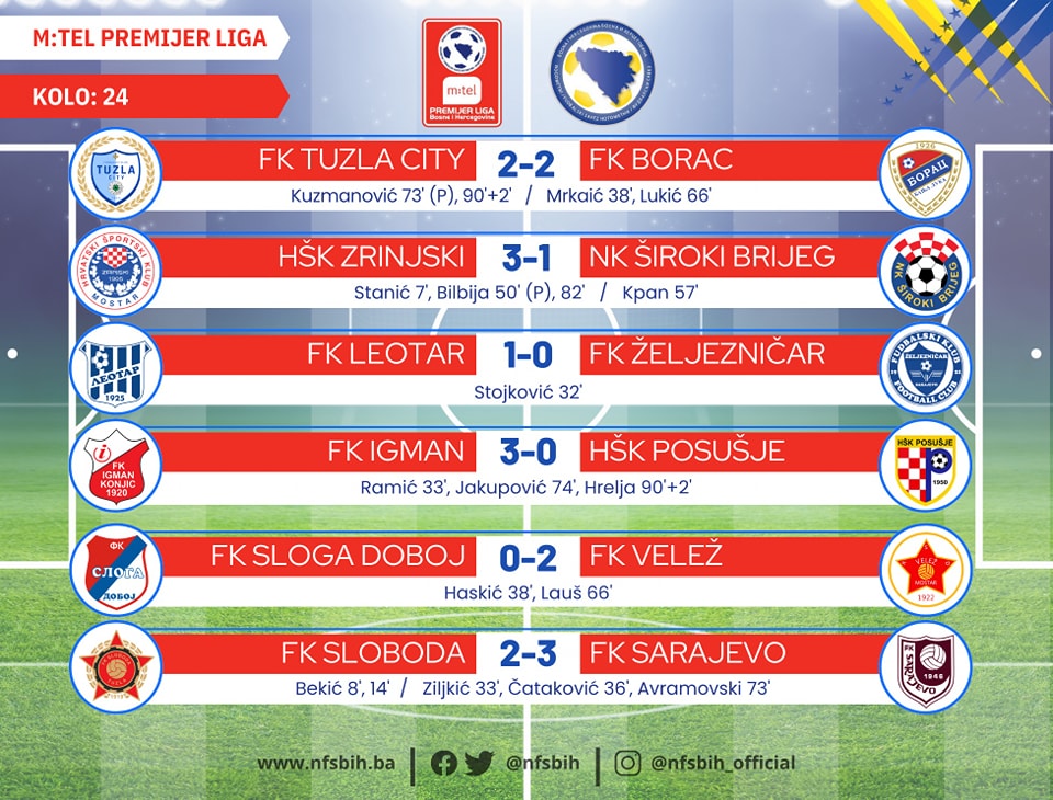 Jučer je Zrinjsku u hercegovačkom derbiju savladao Široki Brijeg sa 3:1, Igman je bio siguran protiv Posušja ostvarivši pobjedu od 3:0, dok je Leotar stigao do minimalne pobjede protiv Željezničara.