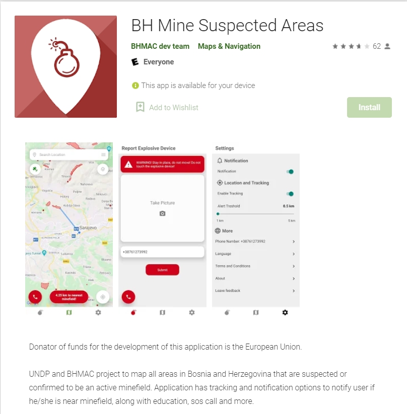 Aplikaciju “BH Mine Suspected Areas“, možete pronaći na Google Play-u i njeno instaliranje je besplatno.
