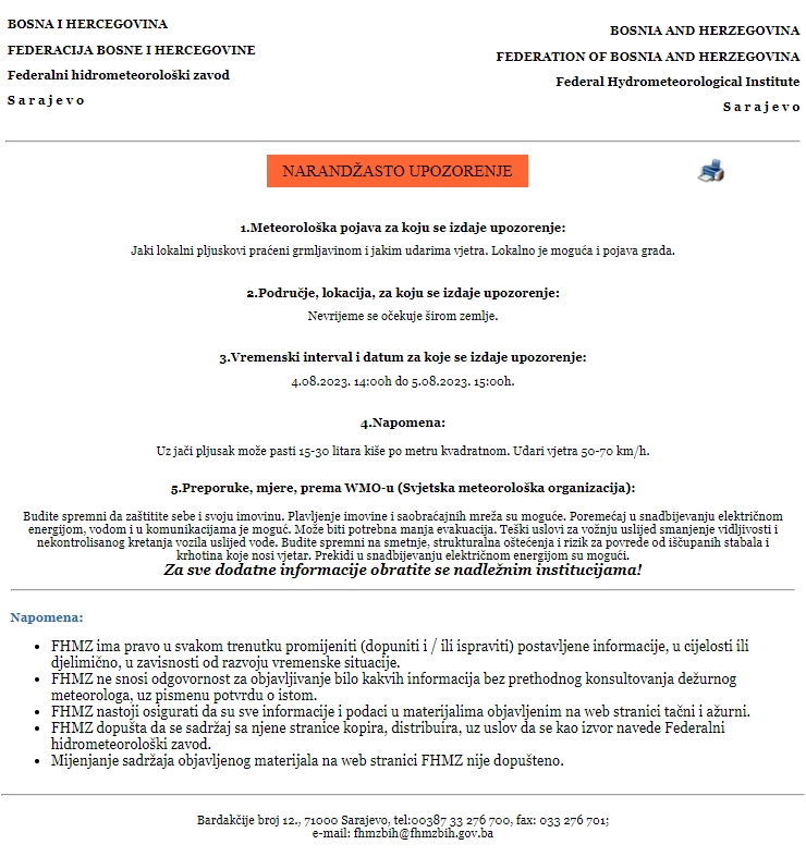 Kako se navodi u upozorenje, građani trebaju biti spremni da zaštitite sebe i svoju imovinu. Plavljenje imovine i saobraćajnih mreža je moguća pojava, kao i poremećaj u snabdijevanju električnom energijom, vodom i u komunikacijama. Teški uslovi za vožnju uslijed smanjenje vidljivosti i nekontrolisanog kretanja vozila zbog vode su također mogući. Budite spremni na smetnje, strukturalna oštećenja i rizik za povrede od iščupanih stabala i krhotina koje nosi vjetar.