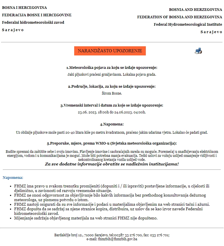 Federalni hidrometeorološki zavod je izdao narandžasto upozorenje za cijelu Bosnu, a zbog jakih pljuskova praćenih grmljavinom i lokalna pojava grada.