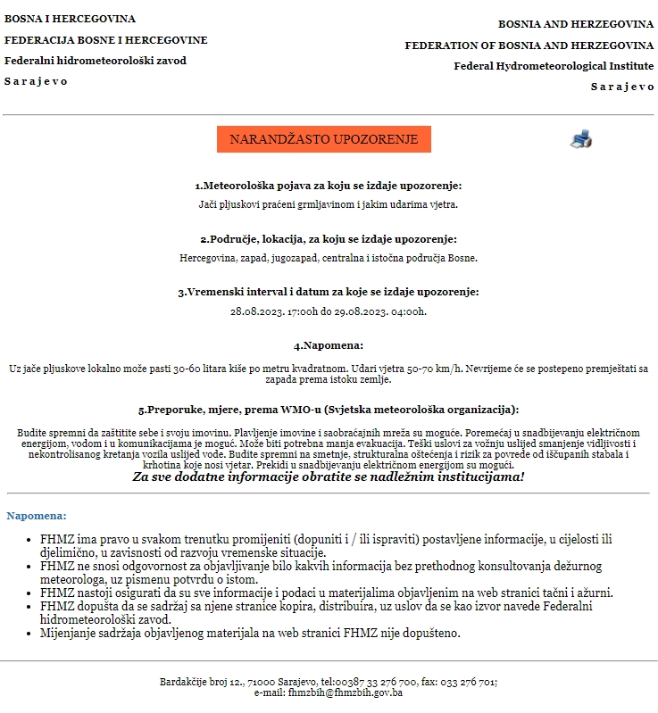 Upozorenje se odnosi na regiju Hercegovine te zapad, jugozapad, centralna i istočna područja Bosne. Uz jače pljuskove lokalno može pasti 30 do 60 litara kiše po metru kvadratnom, a udari vjetra će biti 50-70 km/h.