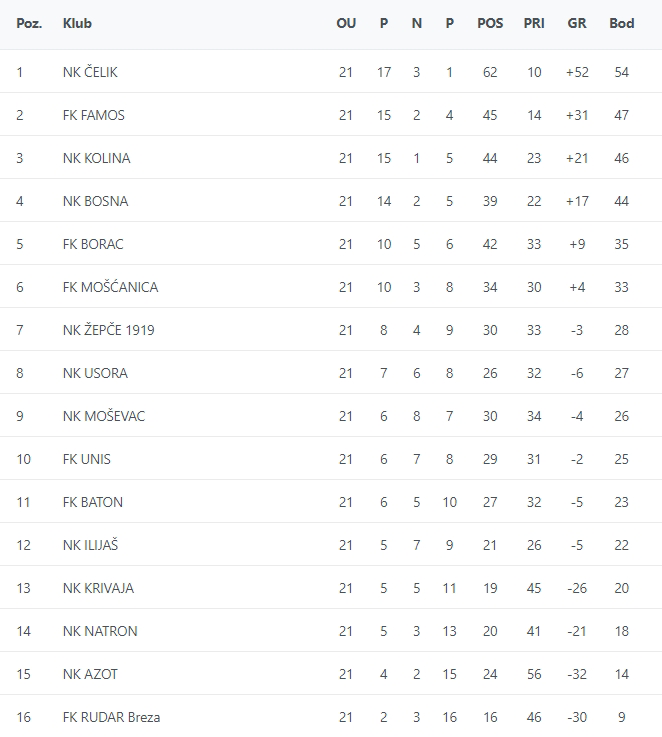 Ekipa Famosa je tako iskoristila kiks Koline te preuzela drugo mjesto sa 47 bodova. Za Krivaju je ovo bio 11. ovosezonski poraz, te ostaje na 20 bodova, a u narednom kolu će u komšijskom derbiju gostovati u Maglaju ekipi Natrona.