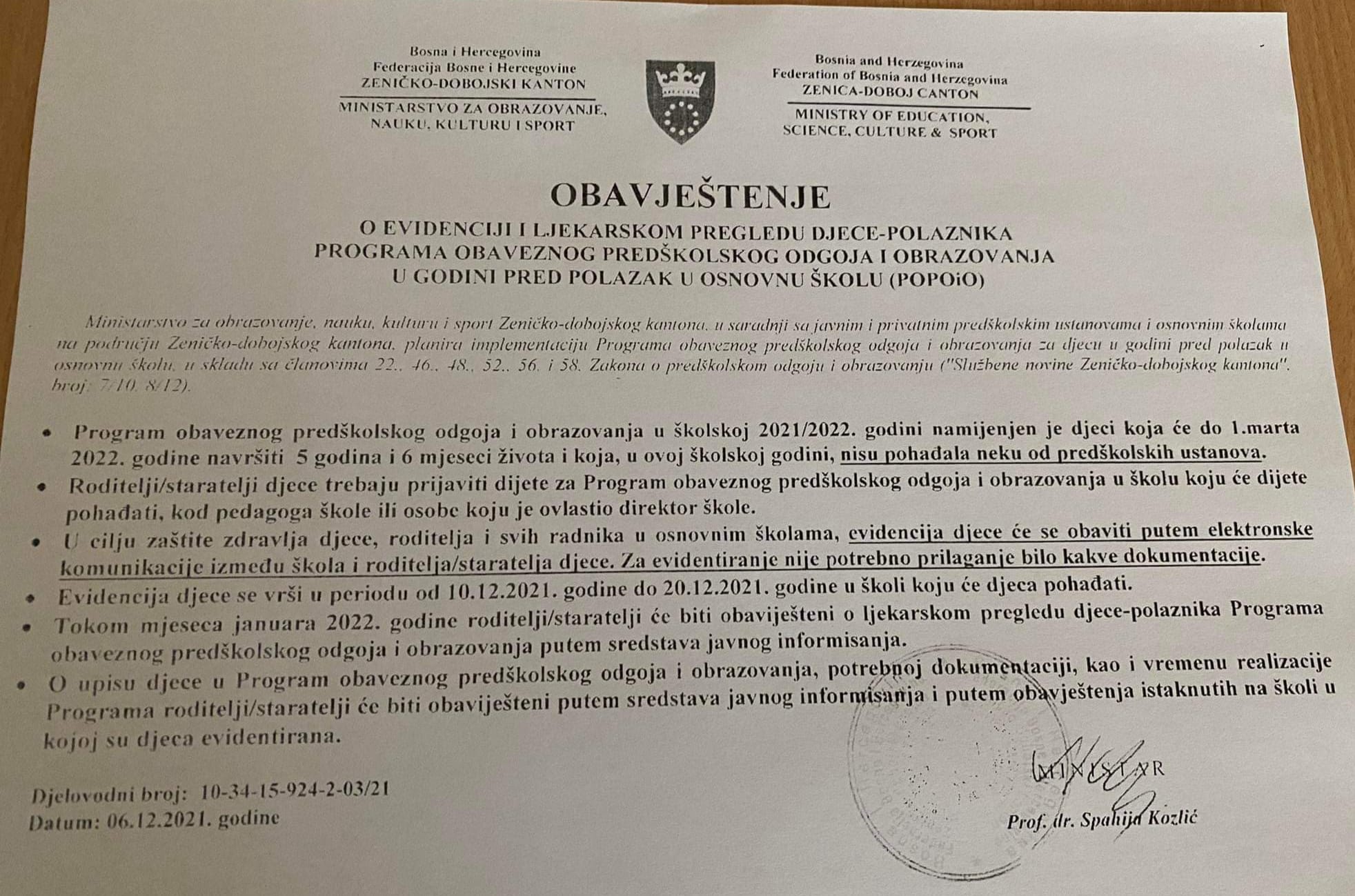 Ministarstvo za obrazovanje, nauku, kulturu i sport Zeničko-dobojskog kantona objavilo je Obavještenje o evidenciji i ljekarskom pregledu djece-polaznika programa obaveznog predškolskog odgoja i obrazovanja i godini pred polazak u osnovnu školu (POPOiO).