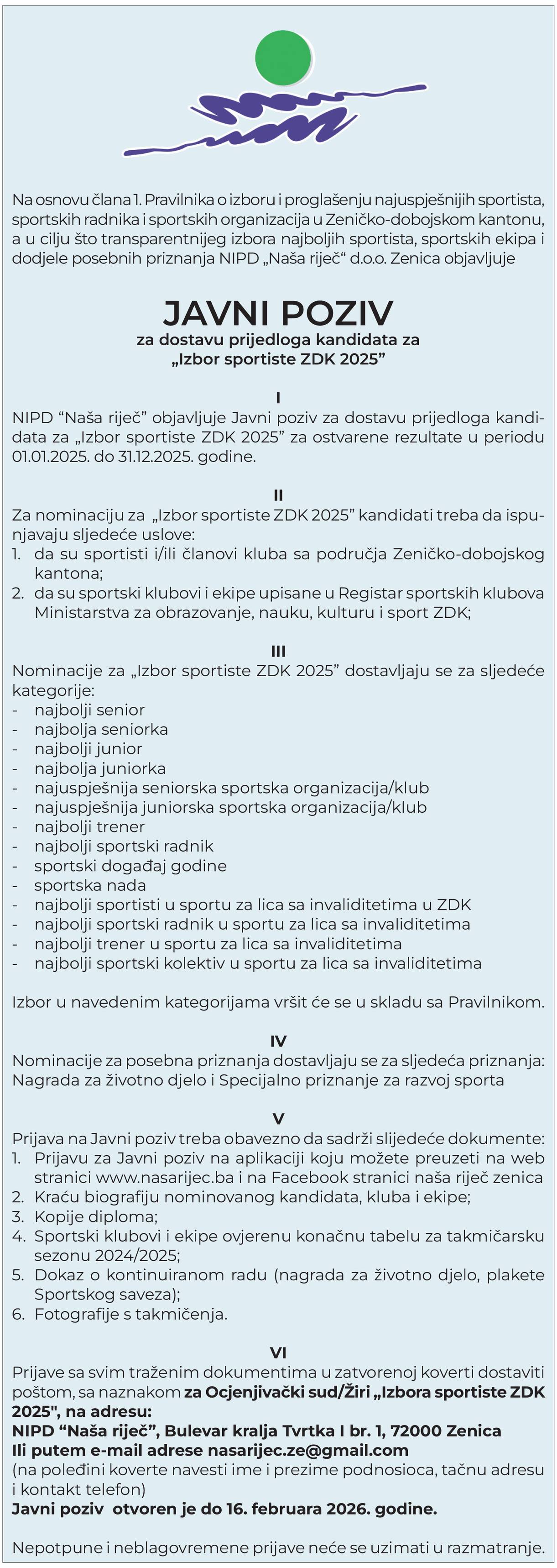NIPD „Naša riječ“ i ove godine organizuje manifestaciju izbora „Sportiste Zeničko-dobojskog kantona 2025“, a tim povodom danas je objavljen i javni poziv za dostavu prijedloga kandidata za ostvarene zapažene rezultate u prošloj godini.
