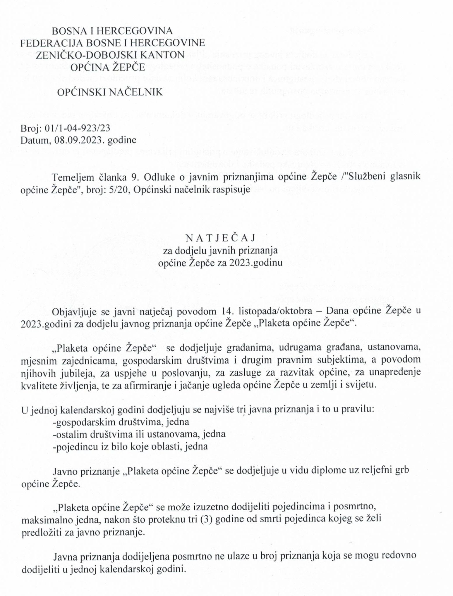 Općina Žepče objavila je Natječaj/Konkurs za dodjelu javnih priznanja općine Žepče za 2023. godinu, a u povodu 14. listopada/oktobra i Dana općine Žepče.