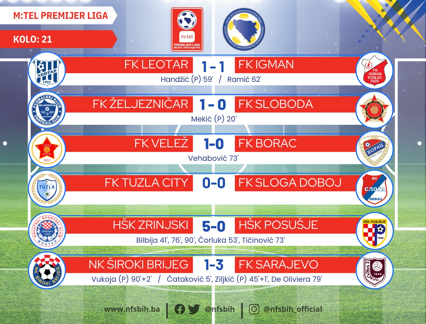 Ovog vikenda odigrani su mečevi 21. kola m:tel Premijer lige BiH u fudbalu, a po tri meča su odigrana jučer i danas.