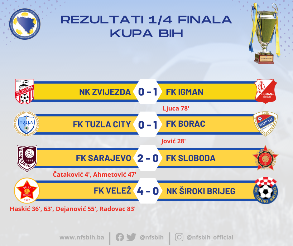Danas su na fudbalskim terenima u Bosni i Hercegovini odigrani prvi susreti četvrtfinala Kupa BiH.
