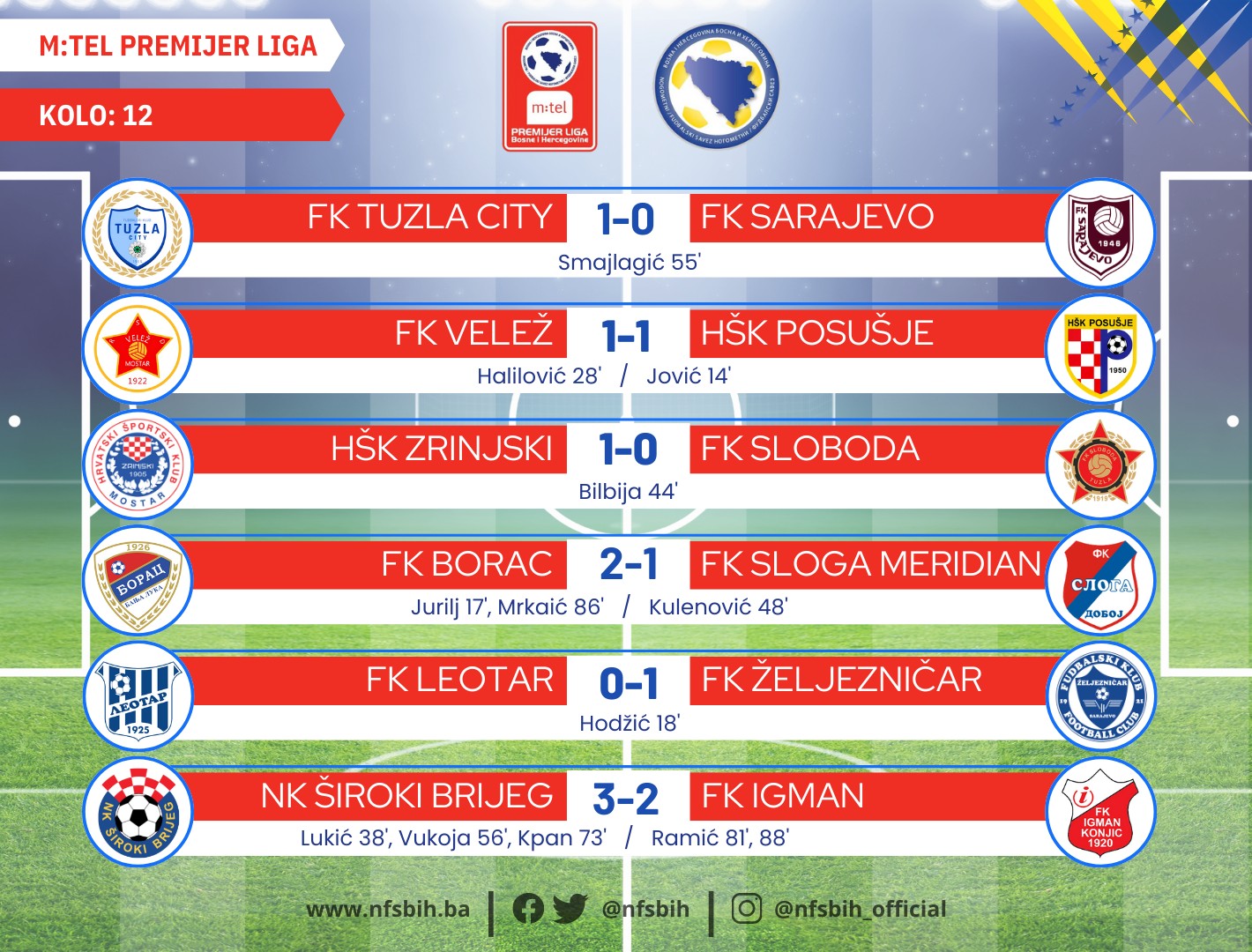 U petak i subotu odigrani su susreti 12. kola m:tel Premijer lige BiH u fudbalu.