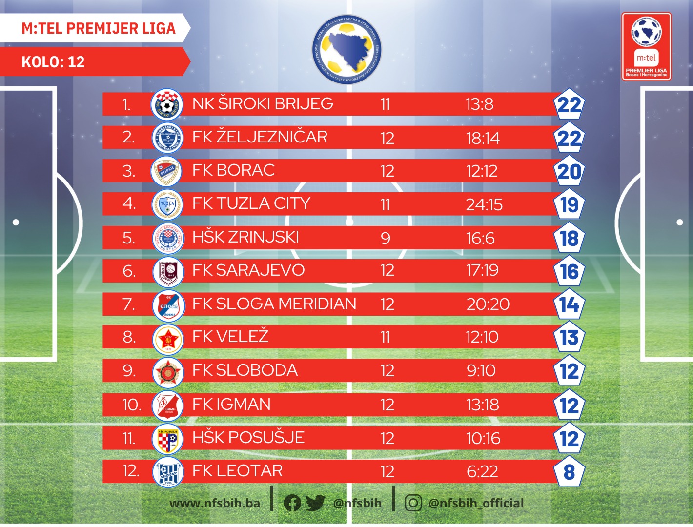 Širokobriježani imaju 22 boda iz 11 utakmica, Željezničar ima isti broj bodova, ali je odigrao utakmicu više. Na začelju tabele je Leotar sa osam bodova.