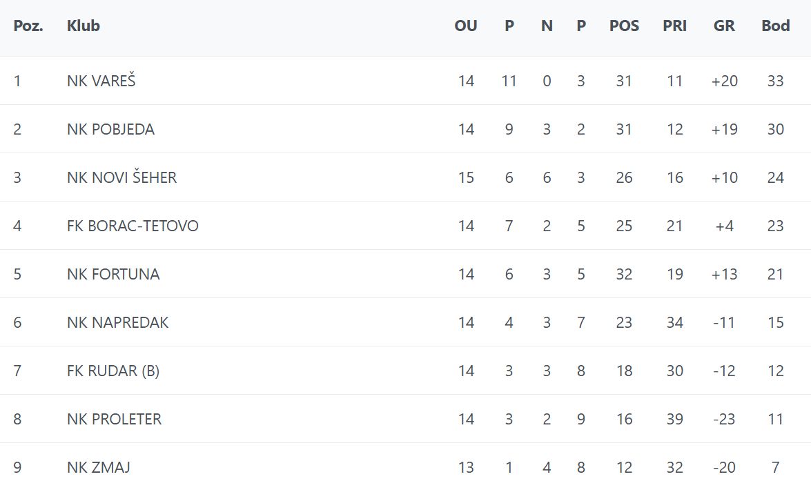 Dva kola prije kraja, u borbi za plasman u viši rang su Vareš sa 33 boda, te Pobjeda koja je na drugom mjestu sa 30 bodova.