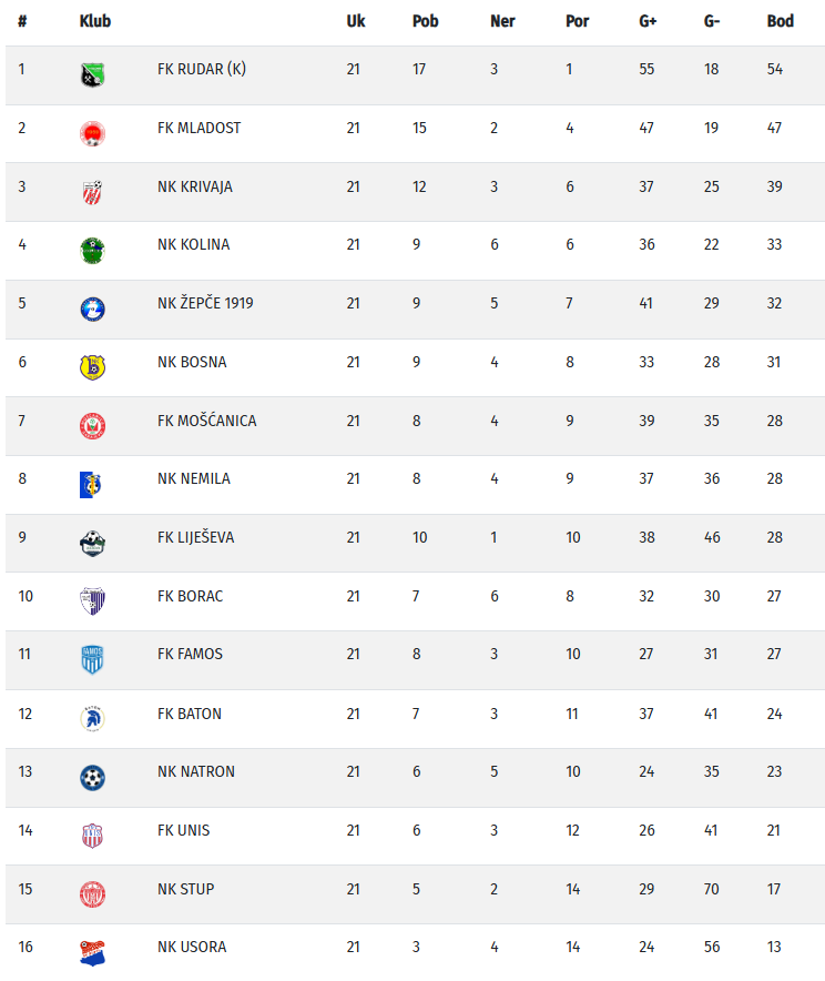 Rudar je trenutno vodeća momčad prrvenstva sa 54 boda, slijedi Mladost sa 47, a treća je Krivaja sa 39 bodova. Situacija je puno neizvjesnija u donjem dijelu tabele. Baton ima 24 boda, jedan manje Natron, dok je Unis sada na 21 bodu. Pretposljednji Stup ima 16 bodova, dok je Usora na posljednjem mjestu sa 13 bodova.