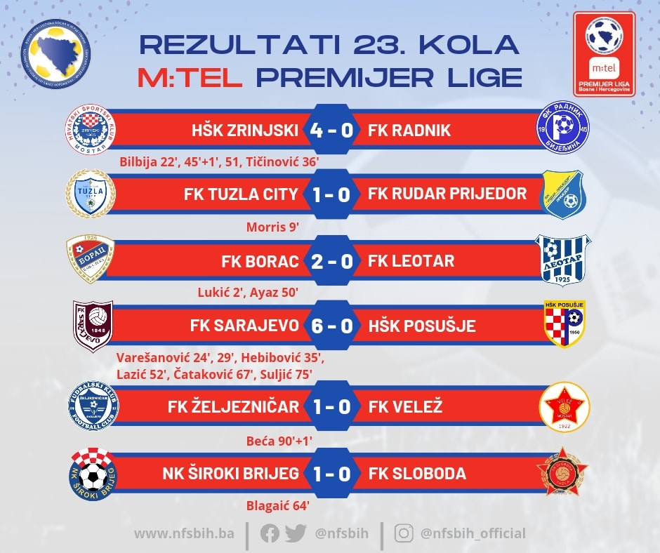 Jučer je kompletirano 23. kolo m:tel Premijer lige BiH u kome su domaćini imali stopostotnu uspješnost, a naše prvoligaše sada očekuje pauza zbog utakmica nacionalnih timova.