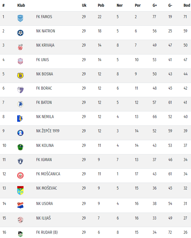 Rudar je posljednji sa 26 bodova, Ilijaš ima jedan bod više, Usora 31, a Moševac 32 boda.