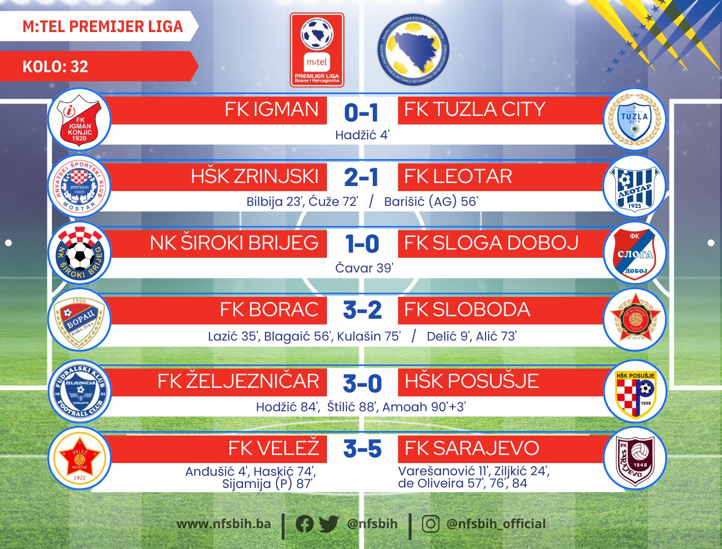Dobre izglede za izlazak u Evropu je sačuvao i Željezničar koji je u završnici slomio otpor Posušja i slavio sa 3:0, kao i Široki Brijeg koji je s minimalnih 1:0 bio bolji od Sloge.