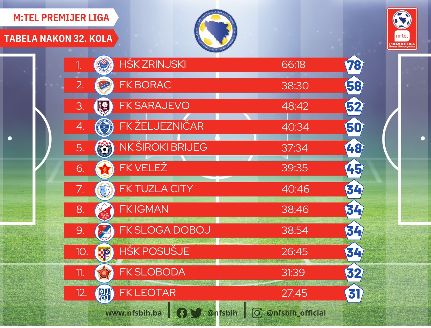 Danas su odigrani mečevi 32. kola m:tel Premijer lige BiH u fudbalu, a dok je situacija u borbi za Evropu dosta jasnija, bitka za opstanak će biti neizvjesna i u posljednjem kolu.