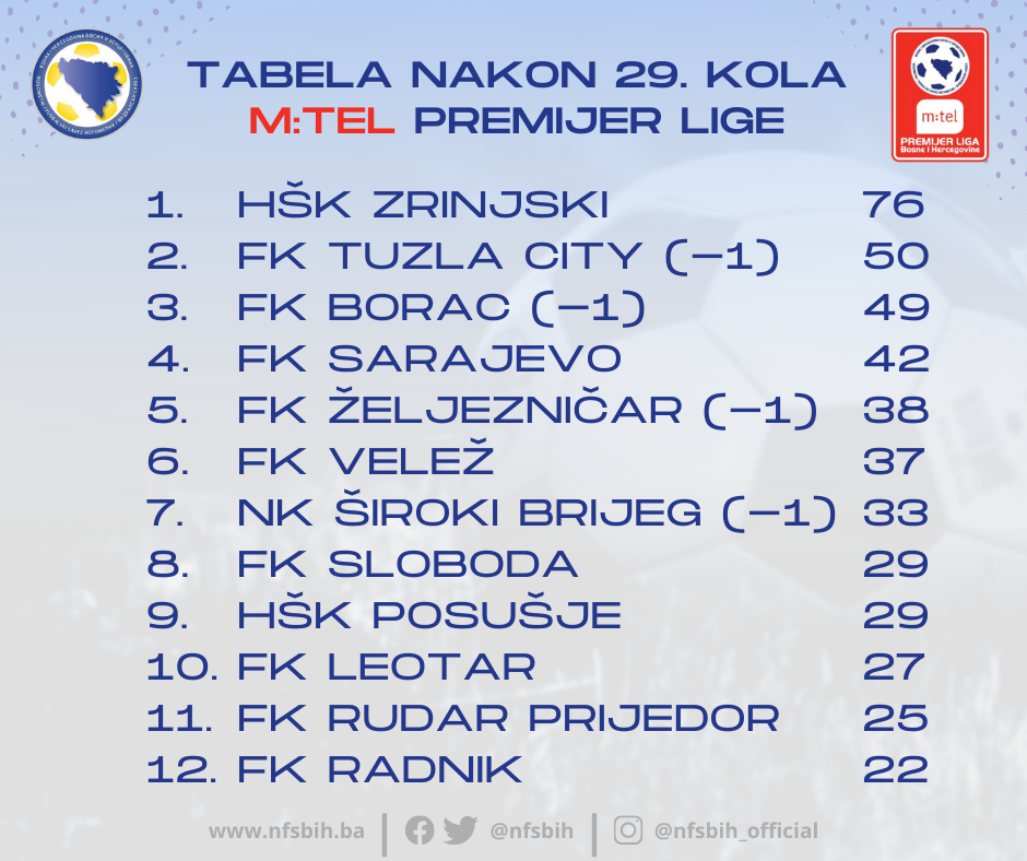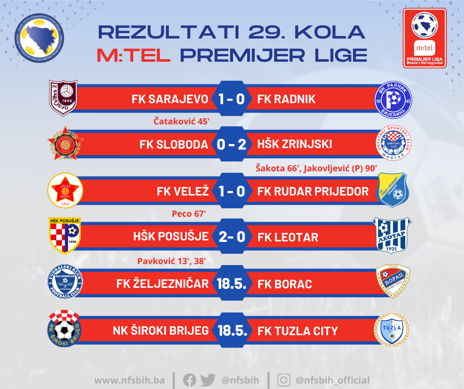 U protekla dva dana odigrana su četiri meča 29. kola m:tel Premijer lige BiH, dok će dva preostala meča biti odigrana 18. maja.