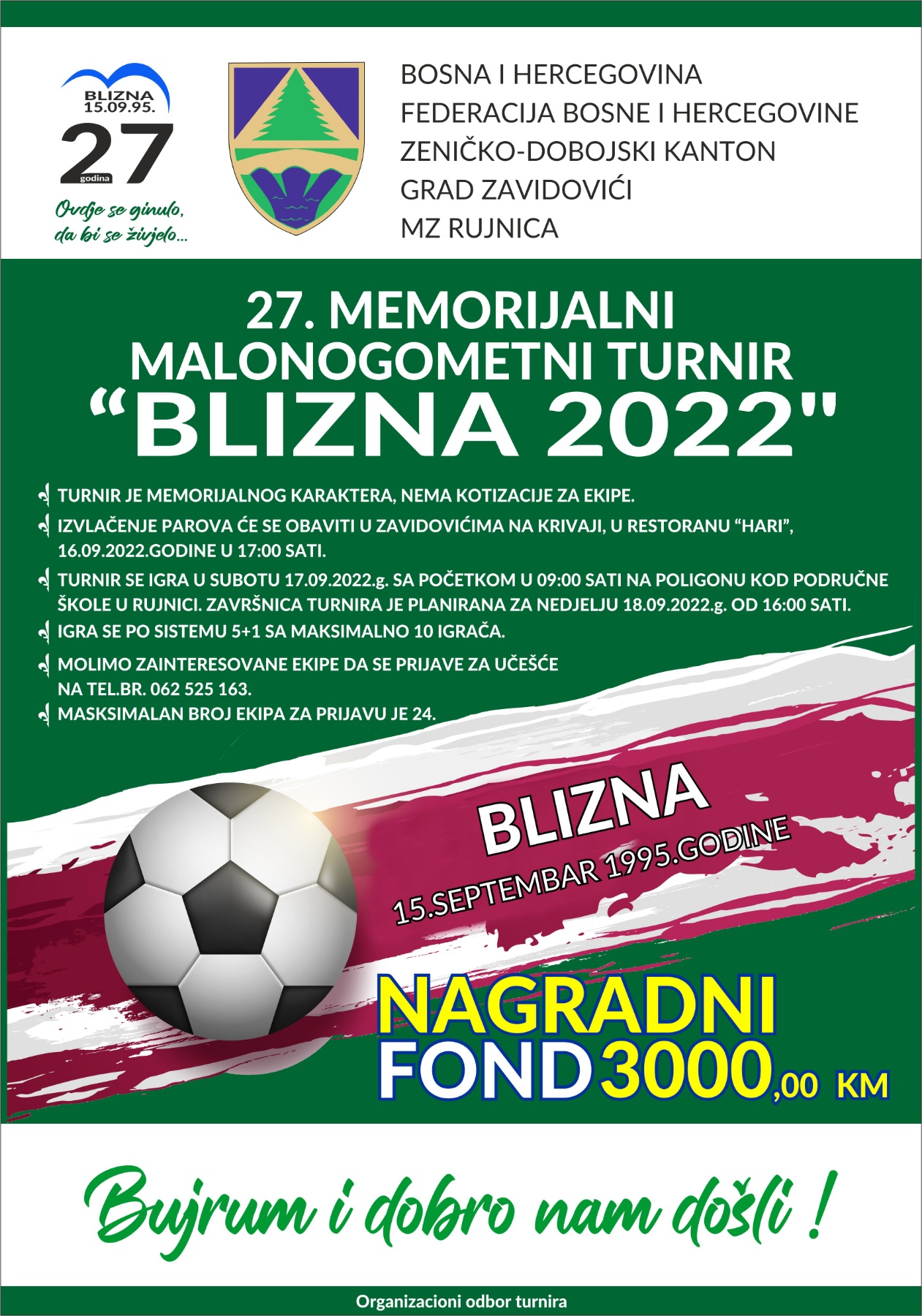 Prijave ekipe se mogu izvršiti na broj 062 525 163, a nagradni fond iznosi 3000 KM.