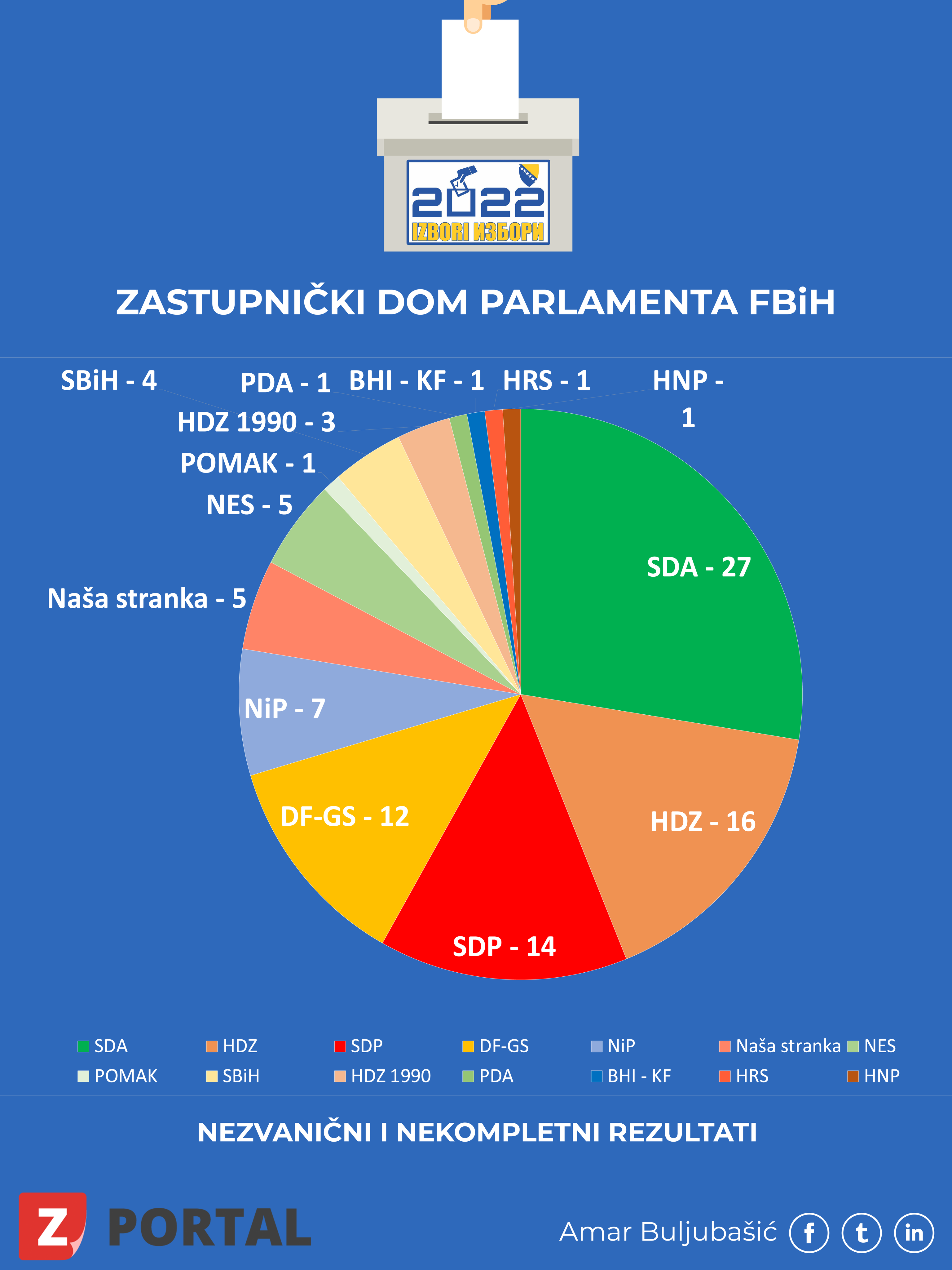Na zvaničnoj internet stranici Centralne izborne komisije, objavljeni su rezultati glasanja nakon 79% obrađenih biračkih mjesta. Na osnovu tih podataka vam donosimo raspored mandata u Zastupničkom domu Parlamenta FBiH.