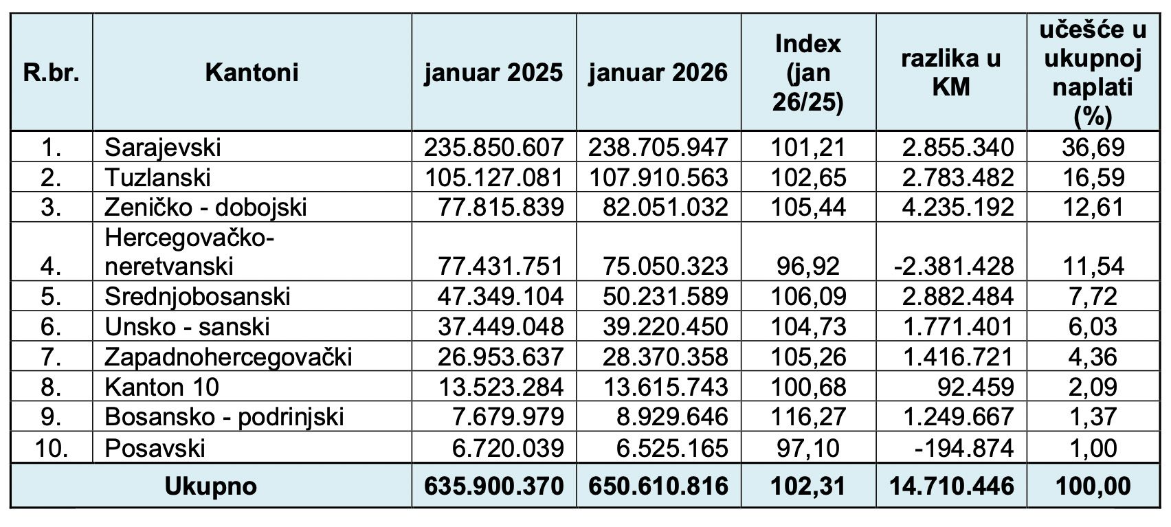 U odnosu na januar prošle 2025. godine zabilježeno je povećanje za 14.710.446 KM, odnosno, uplaćeni javni prihodi su veći za 2,31%.