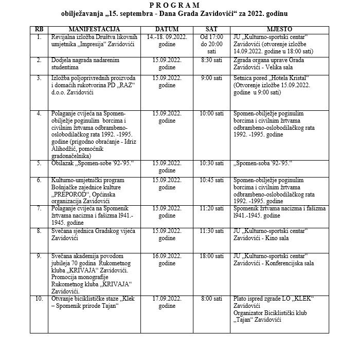 Svakog 15. septembra se obilježava Dan Grada Zavidovići, a i ove godine je pripremljen kulturno-historijski i zabavni program kao i druge aktivnosti u povodu obilježavanja ovog historijski važnog datuma za grad Zavidoviće.