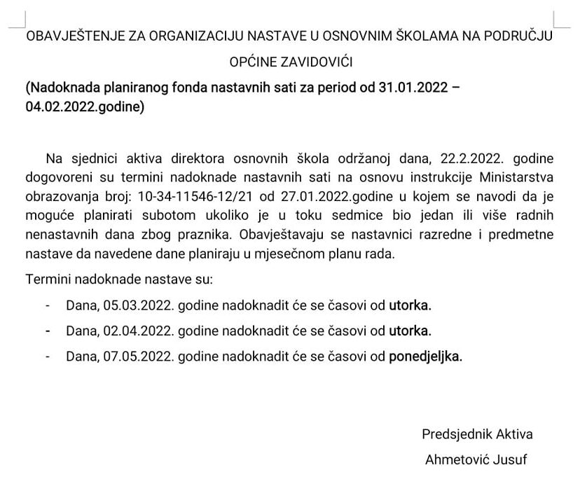 Na sjednici aktiva direktora koja je održana u utorak, 22. februara, dogovoreni su termini nadoknade nastavnih sati za učenike osnovnih škola s područja općine Zavidovići, a na osnovu instrukcije Ministarstva za obrazovanje, nauku, kulturu i sport Zeničko-dobojskog kantona.
