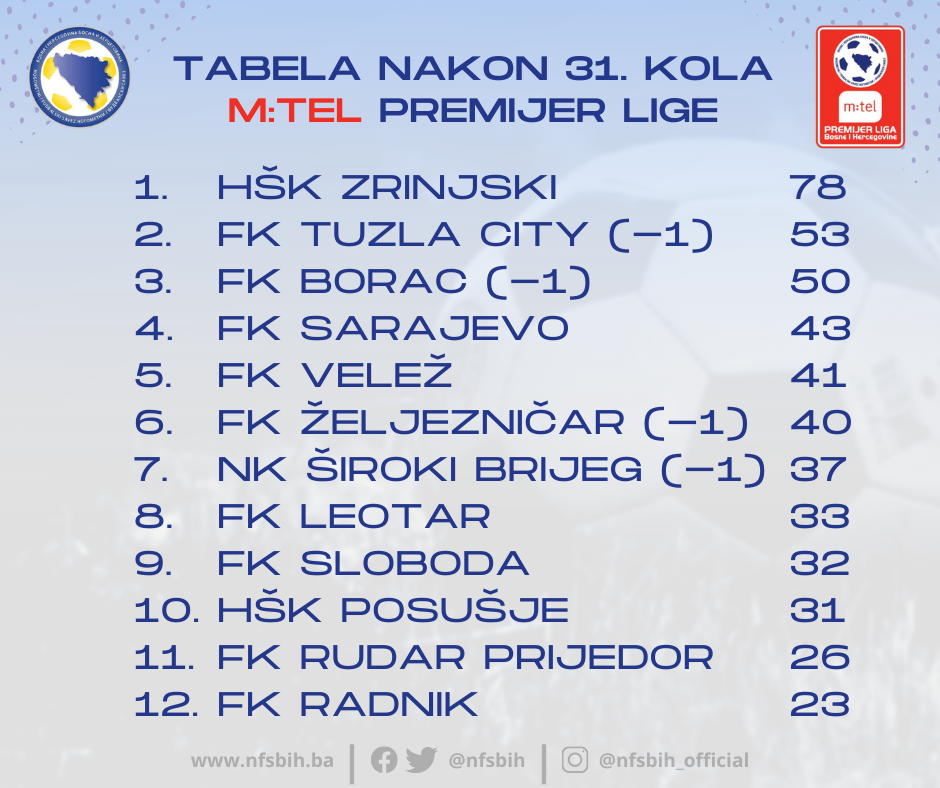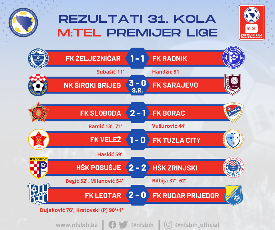 Večeras je utakmicom na Grbavici između Željezničara i Radnika kompletirano 31. kolo m:tel Premijer lige BiH.