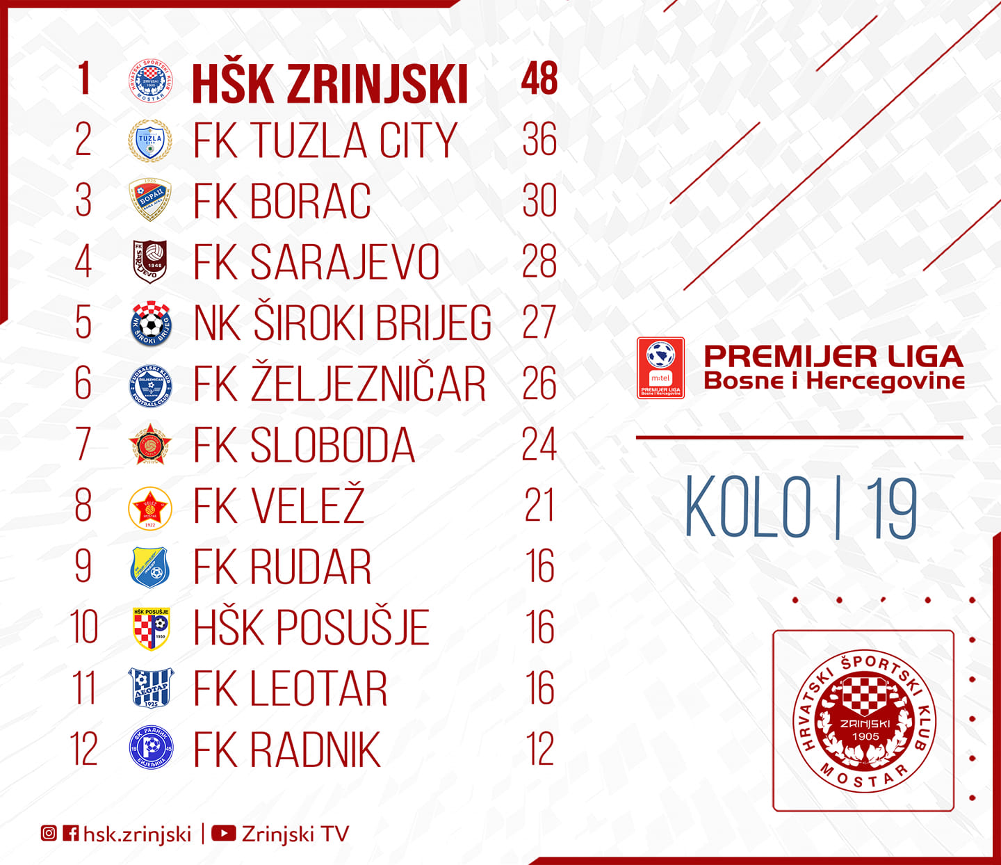 Slijedi Sarajevo s 28 bodova, Široki Brijeg ima bod manje, Željezničar je skupio 26 bodova, Sloboda na svom kontu ima 24 boda, a krug klubova iz sredine tabele i sigurne zone završava Velež koji ima 21 bod.