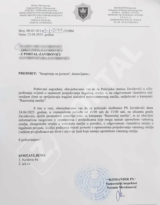 S tim u vezi, iz PS Zavidovići obavještavaju da će njihovi policijski službenici danas 24.4.2025. godine, u vremenskom periodu od 11 sati do 13 sati, na ulicama grada Zavidovića, dijeliti promotivni materijal – letke za kampanju “Razoružaj nasilje”, te će obavljati informativne razgovore o opasnostima i posljedicama koje mogu nastati upotrebom vatrenog oružja, zloupotrebe oružja u kontekstu nasilja u porodici, o odgovornom vlasništvu oružja u legalnom posjedu, u cilju podizanja svijesti javnosti o opasnostima posjedovanja vatrenog oružja i teškim posljedicama po život i zdravlje ljudi koje nastaju upotrebom vatrenog oružja.