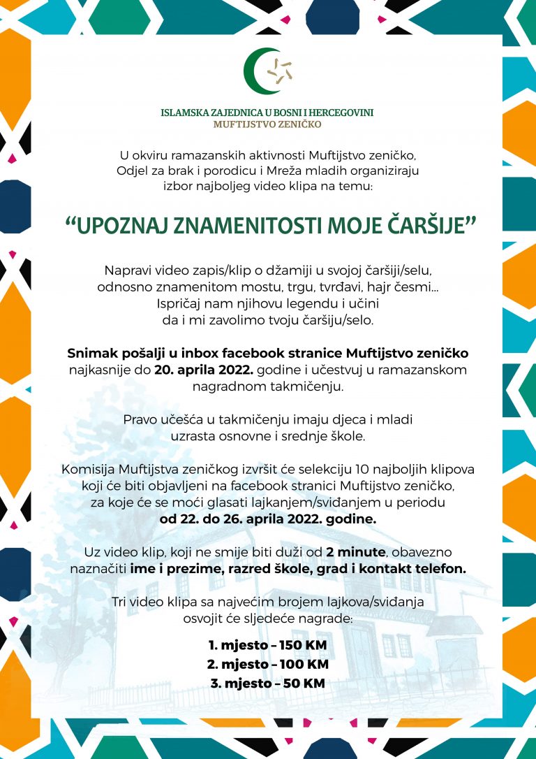 Video je potrebno poslati u inbox Facebok stranice Muftijstva zeničkog do 20. aprila, a glasanje će trajati od 22. do 26. aprila.