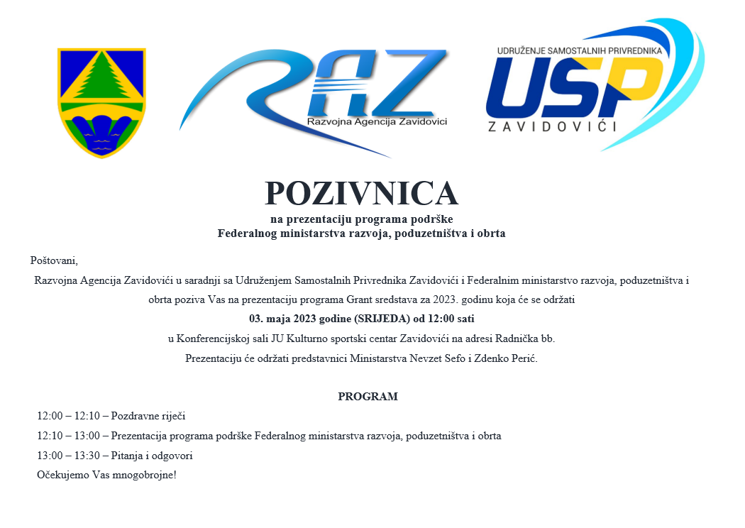Razvojna agencija Zavidovići (RAZ) je objavila poziv za prezentaciju programa podrške Federalnog ministarstva razvoja, poduzetništva i obrta.