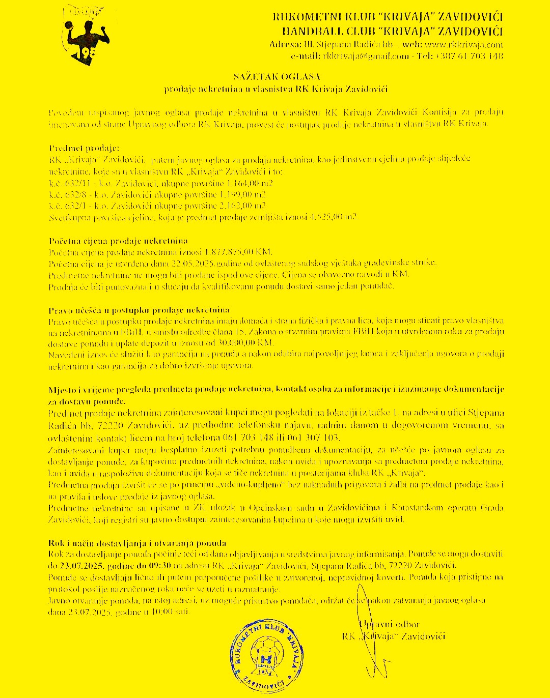 RK Krivaja raspisao je javni oglas za prodaju nekretnina u vlasništvu RK Krivaja Zavidovići, a Komisija za prodaju imenovana od strane Upravnog odbora RK Krivaja će provest postupak prodaje nekretnina.