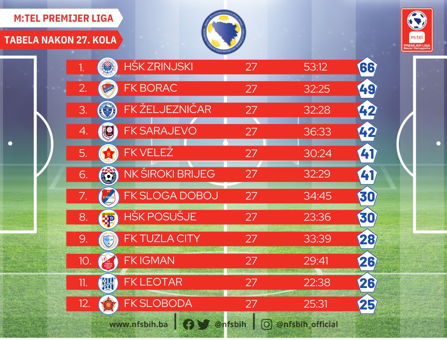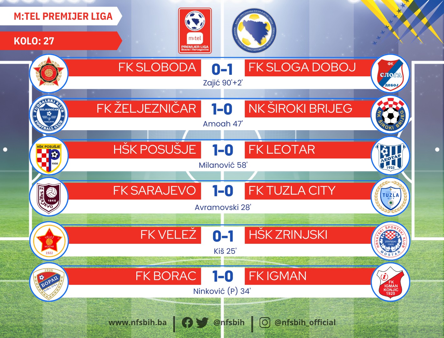 Danas je kompletirano 27. kolo m:tel Premijer lige BiH u fudbalu, a čak svaki od šest utakmica je završen rezultatom 1:0. U četiri navrata su slavili domaćini, a u dva meča su gosti odnijeli bodove.