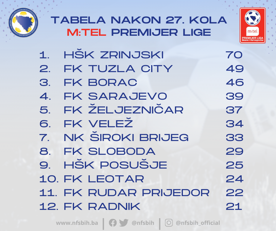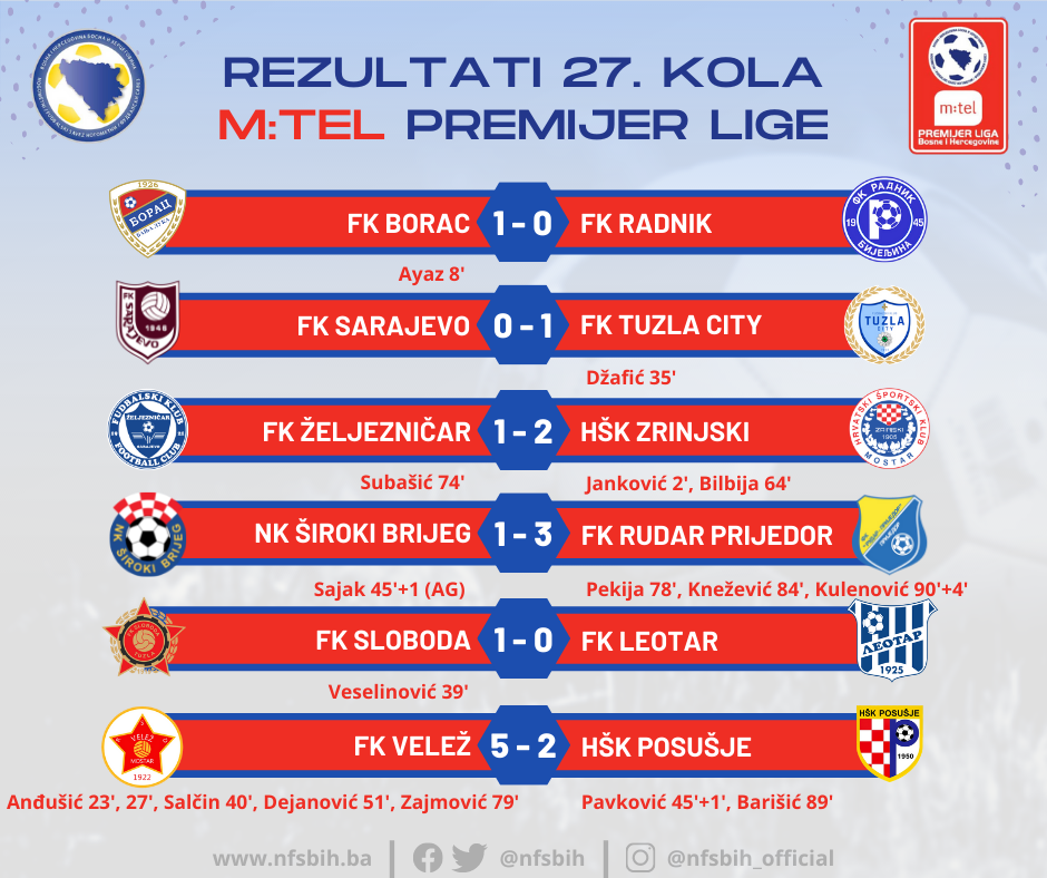 Sinoć je u Mostaru susretom Veleža i Posušja kompletirano 27. kolo m:tel Premijer lige BiH, te nas do kraja sezone dijeli još šest kola.